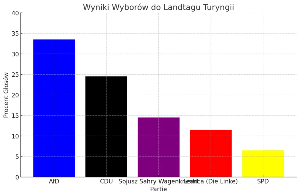 Wybory do landtagu Turyngii, kraju związkowego na wschodzie Niemiec, przyniosły niespodziewane zwycięstwo prawicowej Alternatywie dla Niemiec (AfD). Zgodnie z wynikami exit poll, partia ta zdobyła aż 33,5 proc. głosów, co stanowi znaczący wzrost poparcia w regionie, który tradycyjnie uchodził za bardziej konserwatywny. AfD zwycięża coraz mocniej.