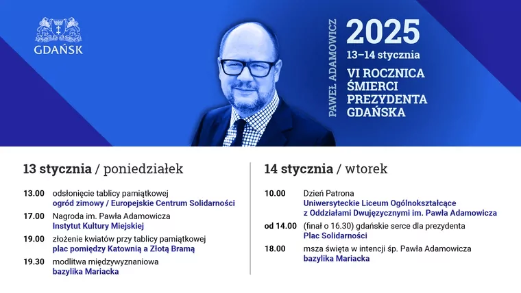 W dniach 13-14 stycznia 2025 Gdańsk uczci 6. rocznicę tragicznej śmierci prezydenta Pawła Adamowicza. Przygotowano szereg wydarzeń, które będą okazją do refleksji, wspomnienia jego działalności i wyrażenia sprzeciwu wobec nienawiści. Zaplanowano m.in. wspólnie złożenie kwiatów przy płycie upamiętniającej wydarzenie z 2019 roku, uczczenie Dnia Patrona razem ze szkolną społecznością Uniwersyteckiego Liceum Ogólnokształcącego oraz odsłonięcie tablicy pamiątkowej w ECS. Po raz czwarty ogłoszony zostanie także laureat Nagrody im. Pawła Adamowicza.