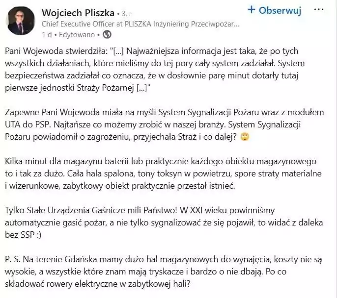 Pliszka podkreśla, że przy pożarze w magazynie baterii każda sekunda ma znaczenie.