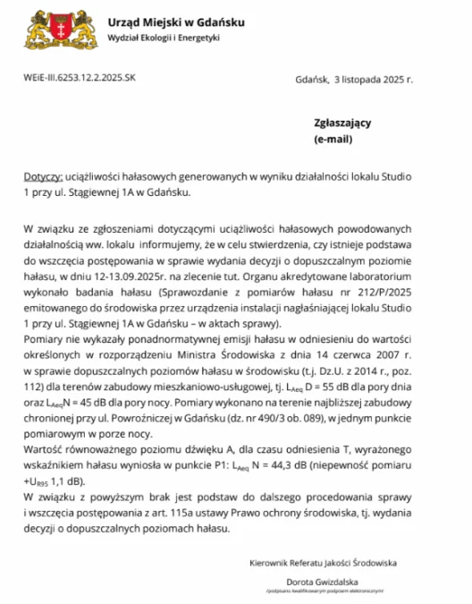 Pismo z urzędu datowane na jesień 2025 roku dotyczy lokalu „Studio 1” przy ulicy Stągiewnej 1A, od miesięcy wskazywanego przez mieszkańców jako jedno z głównych źródeł nocnych uciążliwości w Śródmieściu. Po serii skarg i interwencji miasto zleciło akredytowanemu laboratorium pomiar hałasu.