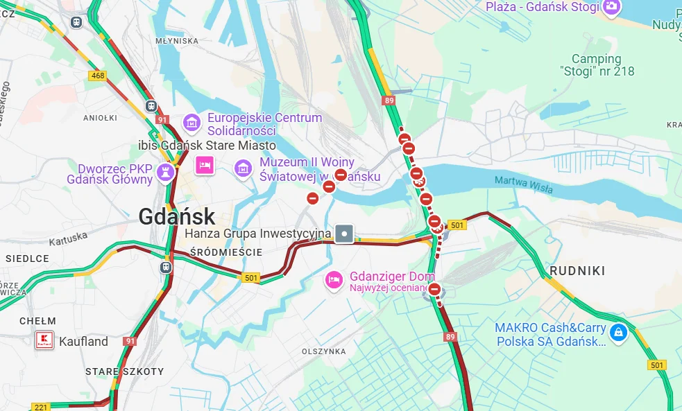 Autobusy miejskie linii T8, 111 i 138, jadące w stronę Stogów, zostały przekierowane przez centrum miasta. Nowa trasa przebiega przez ul. Jana z Kolna, Marynarki Polskiej, tunel pod Martwą Wisłą, a następnie Sucharskiego.