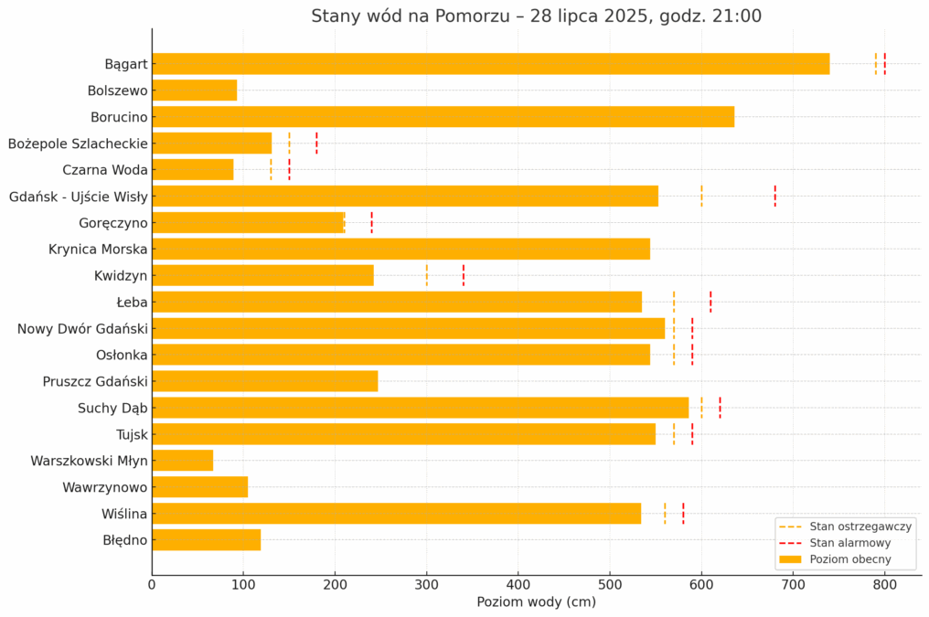 Pomorze znalazło się w strefie hydrologicznego ryzyka. Dane z 28 lipca wskazują, że wiele miejscowości osiąga niepokojące poziomy wód. W Elblągu, gdzie rzeka przekroczyła 740 cm, normą ostrzegawczą jest 790 cm, a alarmową 800 cm. To zaledwie kilkadziesiąt centymetrów od granicy, po której lokalne służby mogą wprowadzać stany wyjątkowe.