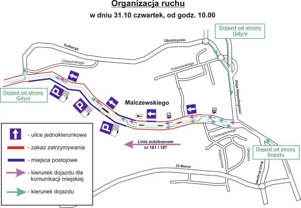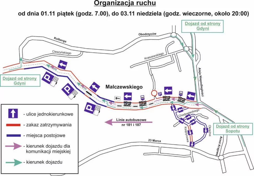 W piątek, 1 listopada 2024 r. ruch jednokierunkowy obowiązywać będzie już od al. Niepodległości do ul. Kolberga. By usprawnić funkcjonowanie komunikacji miejskiej, na odcinku ul. Malczewskiego, od ul. Chodowieckiego do wysokości kościoła, na prawym pasie jezdni, wyznaczony zostanie buspas.