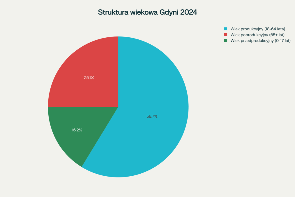 Dominacja grupy produkcyjnej (ponad 58% populacji) wskazuje na atrakcyjność Gdyni dla osób w wieku zawodowym oraz stabilne wsparcie rynku pracy. Jednocześnie 15,9% mieszkańców to seniorzy, co stawia przed miastem wyzwania w zakresie opieki zdrowotnej i świadczeń społecznych.