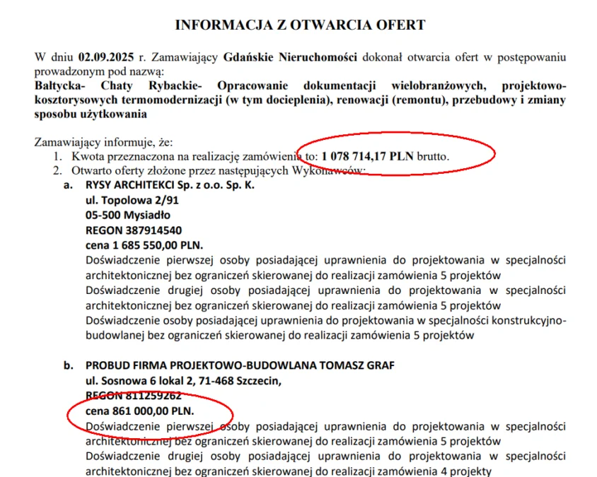 Gdańskie Nieruchomości unieważniły przetarg na opracowanie dokumentacji projektowej dla zespołu zabytkowych chat rybackich w Jelitkowie. Oferty otwarto 2 września 2025 r., ale decyzję o anulowaniu postępowania wydano dopiero 5 grudnia. Oficjalnym powodem było przekroczenie budżetu, choć najtańsza z ofert była o ponad 200 tys. zł niższa od zaplanowanej kwoty.