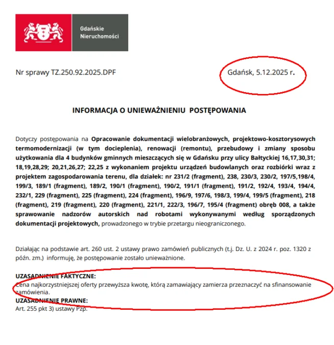 - Przetarg anulowano 94 dni po otwarciu ofert, mimo że jedna z nich była znacznie poniżej budżetu.