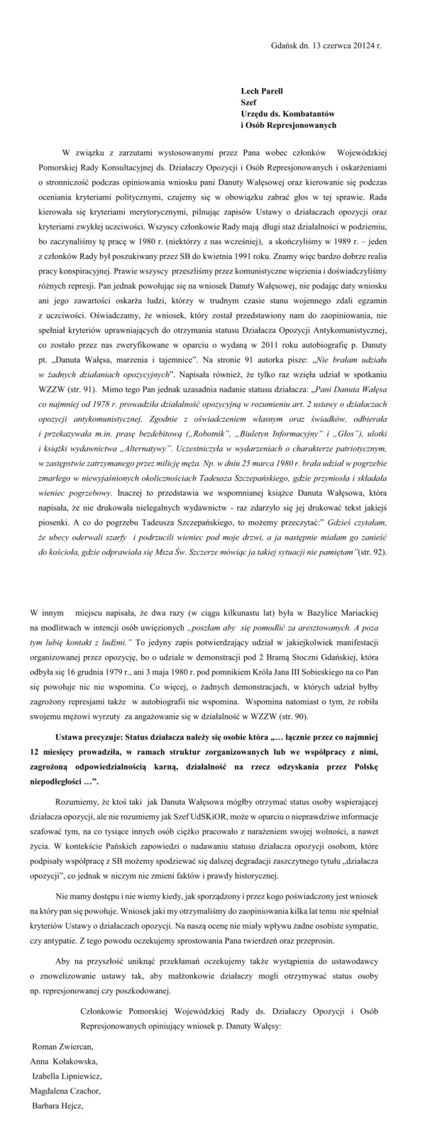 Pomorska Rada Konsultacyjna ds. Działaczy Opozycji i Osób Represjonowanych oficjalnie odniosła się do zarzutów Lecha Parella, szefa UdSKIOR. Oskarżenia dotyczą stronniczości przy opiniowaniu wniosku Danuty Wałęsowej, która według Parella, powinna otrzymać status działacza opozycji antykomunistycznej. Rada stanowczo zaprzecza, jakoby przy ocenianiu wniosku kierowała się kryteriami politycznymi.