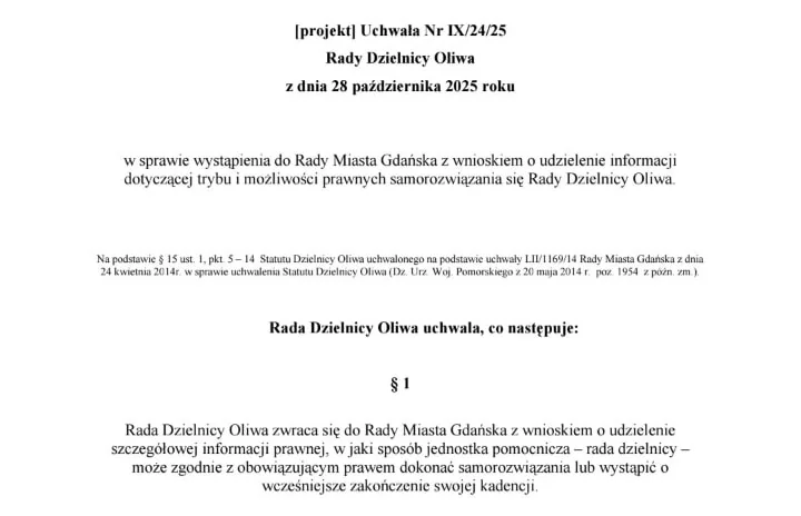 Równolegle, choć z pozoru niezależnie, w dzielnicy Oliwa toczy się inna historia. 28 października 2025 roku Rada Dzielnicy Oliwa podejmuje uchwałę, która wywołuje poruszenie wśród lokalnych samorządowców. Rada występuje do Rady Miasta Gdańska o udzielenie informacji prawnej – w jaki sposób jednostka pomocnicza, czyli rada dzielnicy, może zgodnie z przepisami prawa dokonać samorozwiązania.
