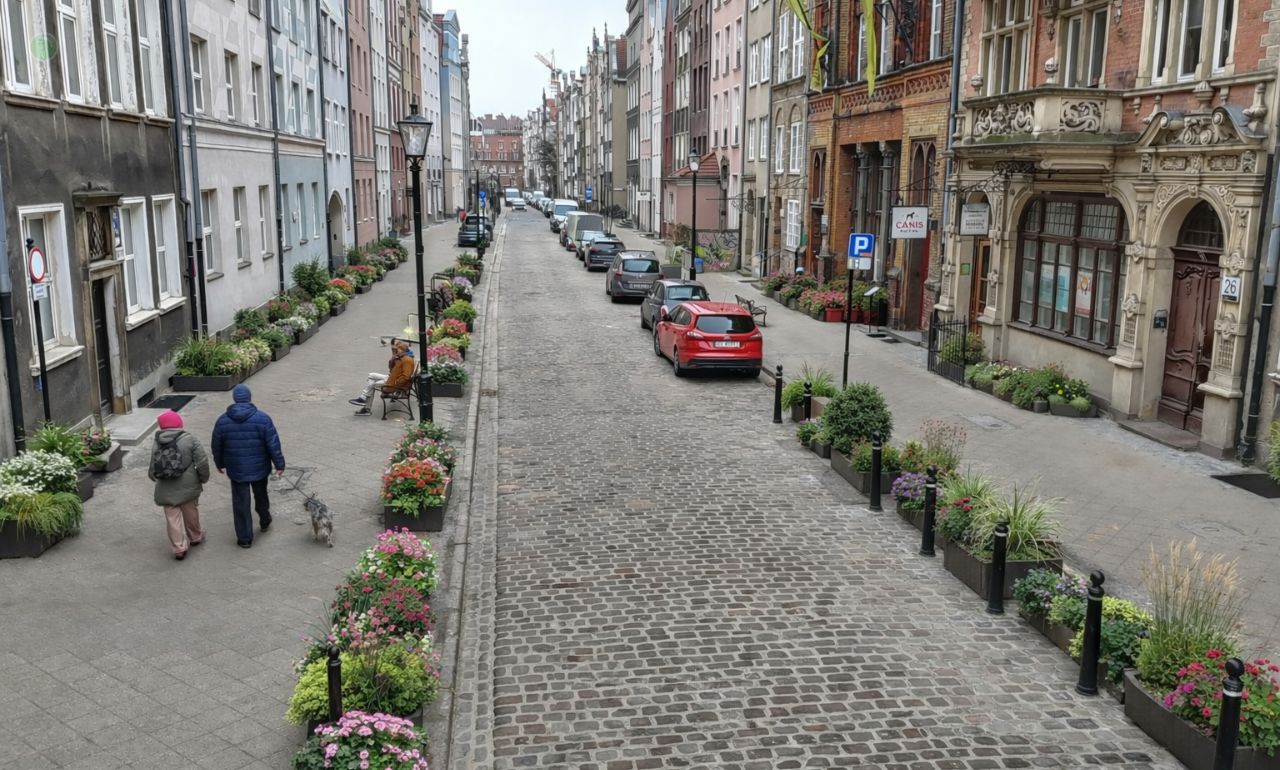 Ulica Ogarna w Gdańsku przeszła gruntowną przebudowę. Prace zaczęły się w 2022 r., a zakończyły na początku 2025 r. Koszt inwestycji wyniósł blisko 15,5 mln zł. Wymieniono sieci podziemne, położono starobruk, zamontowano stylizowane latarnie i małą architekturę. Efekt jest historyczny, uporządkowany, równy. Tylko że wciąż surowy. I pozbawiony drzew.