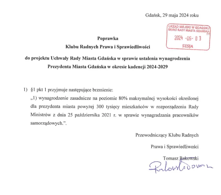 PiS liczy na zdobycie większości w Radzie Miasta dla swojej poprawki, apelując do radnych o odpowiedzialne podejście do finansów miasta i adekwatne wynagradzanie prezydenta Gdańska.