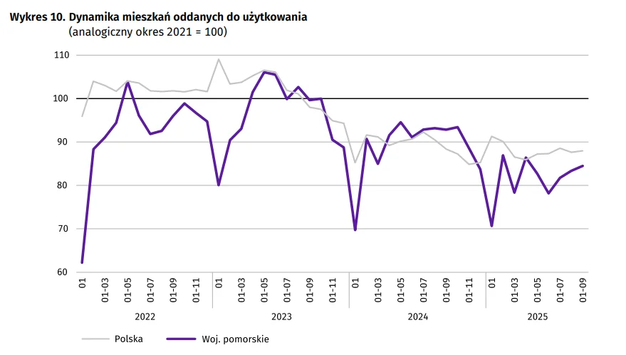 Pomorskie, które jeszcze niedawno cieszyło się rosnącą liczbą nowych inwestycji mieszkaniowych, we wrześniu odnotowało poważne załamanie. W porównaniu z tym samym miesiącem 2024 roku liczba mieszkań, których budowę rozpoczęto, spadła aż o 40,7 proc. To oznacza 802 mniej mieszkań w skali miesiąca. Równocześnie zmniejszyła się też liczba wydanych pozwoleń na budowę lub zgłoszeń z projektem – o 46 mieszkań.