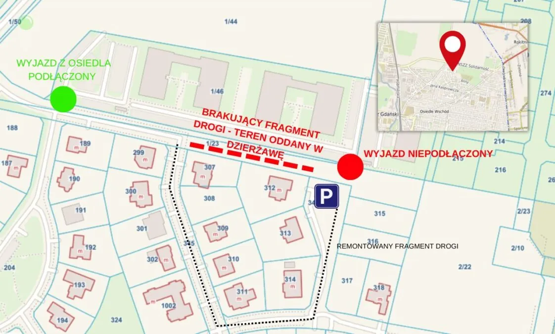 - niezakończona inwestycja jest zakończona parkingiem i blokuje możliwość przedłużenia drogi do ich drugiego wyjazdu z osiedla