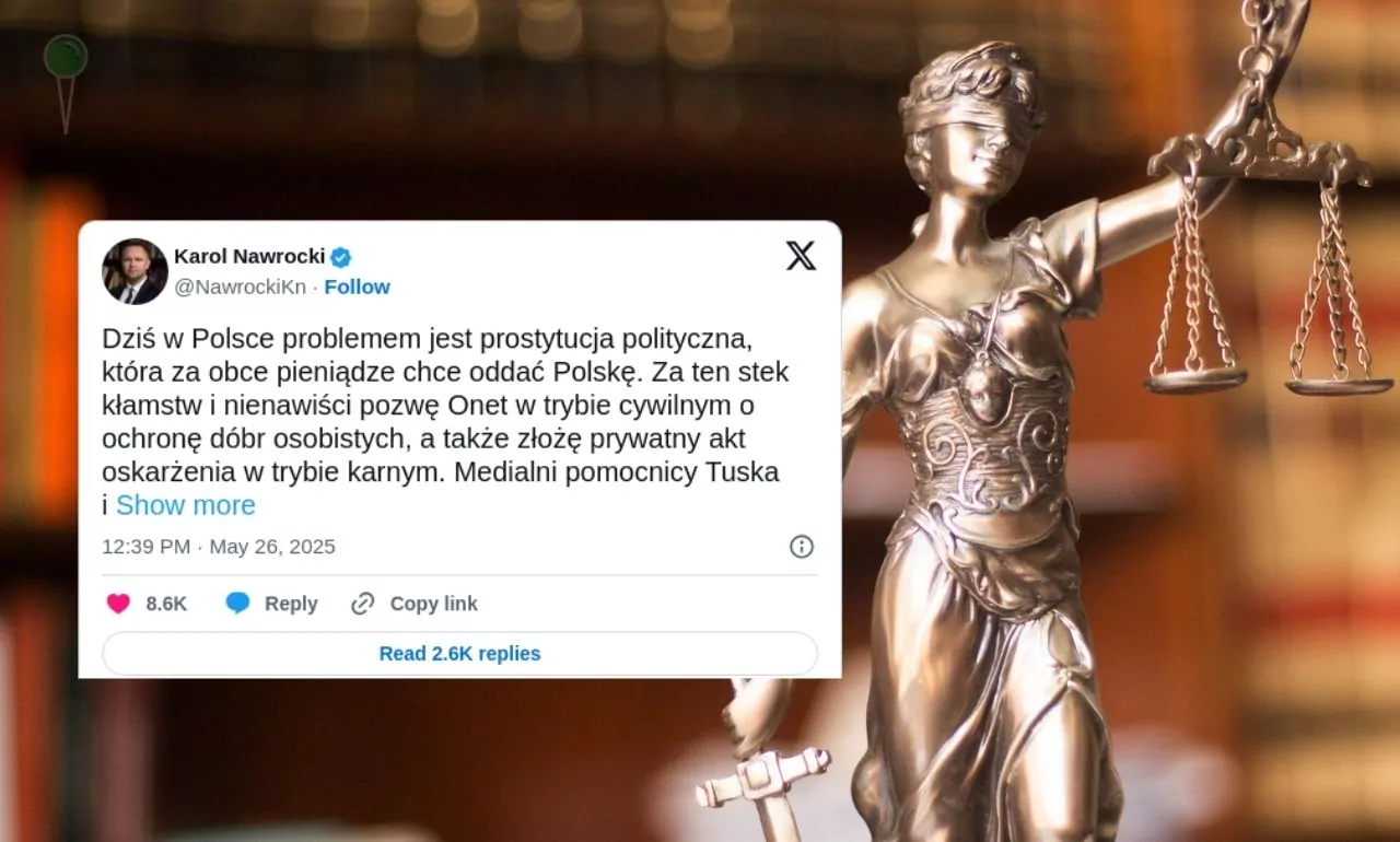 Dziś w Polsce problemem jest prostytucja polityczna, która za obce pieniądze chce oddać Polskę. Za ten stek kłamstw i nienawiści pozwę Onet w trybie cywilnym o ochronę dóbr osobistych, a także złożę prywatny akt oskarżenia w trybie karnym – napisał w mediach społecznościowych Nawrocki.