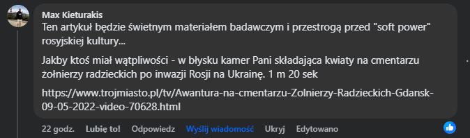 W 2017 roku śp. Paweł Adamowicz składał kwiaty na cmentarzu żołnierzy radzieckich w Gdańsku po tym jak Rosja zajęła Krym i cześć obwodu donieckiego i ługańskiego. Publicznie mówił o upamiętnieniu tych, którzy polegli w walce o wyzwolenie Polski. Są zdjęcia. Są relacje. Nikt nie mówił wtedy o soft power. Nikt nie sugerował działalności prorosyjskiej.