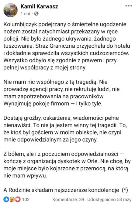 Karwasz dzień po tragedii zdecydował się na radykalny krok: natychmiast wyrzucił z hostelu wszystkich Kolumbijczyków: