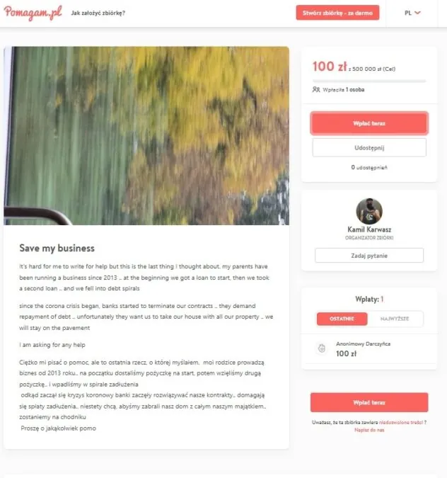 Kolejnym wątkiem związanym z działalnością Kamila Karwasza, właściciela hostelu, w którym mieszkali zatrzymani Kolumbijczycy, jest jego internetowa zbiórka pieniędzy. Na popularnej stronie crowdfundingowej Pomagam.pl Karwasz uruchomił zbiórkę pod nazwą „Save my business” („Uratuj mój biznes”), której celem było zebranie aż 500 tys. zł podczas pandemii. W praktyce zebrano jednak tylko 100 zł od jednego anonimowego darczyńcy.
