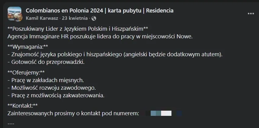 W kolejnym ogłoszeniu z 23 kwietnia br. Karwasz poszukiwał „lidera z językiem polskim i hiszpańskim do pracy w zakładach mięsnych w Nowem”. Podawał w ogłoszeniu swój prywatny numer telefonu i nazwę agencji „Immaginare HR”.