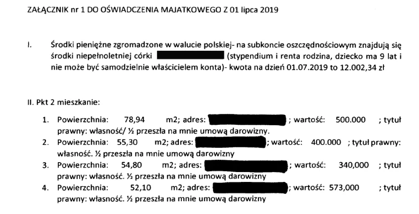 Magdalena Adamowicz posiada również dwa kredyty we frankach szwajcarskich, które regularnie spłaca. Spłaciła też kredyt mieszkaniowy na pół miliona złotych wpisany jeszcze w 2019 r.