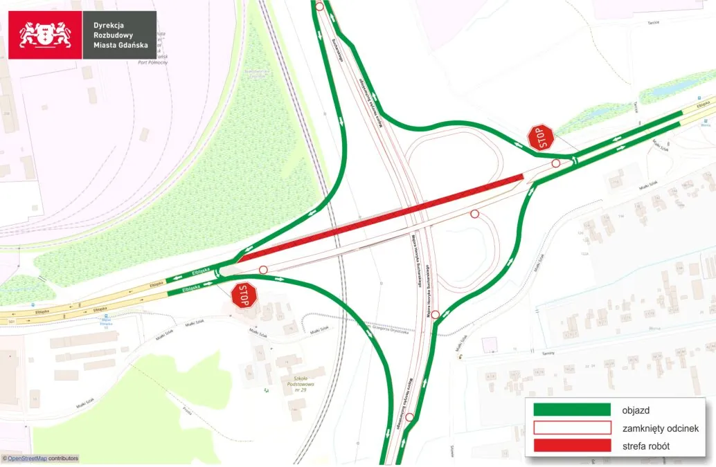 Na czas robót wyznaczono specjalne objazdy. Kierowcy jadący ul. Sucharskiego będą korzystać z istniejących łącznic węzła drogowego. Dla tych, którzy zmierzają ul. Elbląską w stronę Sobieszewa, przewidziano objazd przez węzeł Michałki. Z kolei ruch w stronę centrum zostanie skierowany przez most wantowy i ul. Wosia Budzysza.