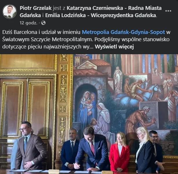 Ponad 20 osób z Pomorza bierze udział w Światowym Szczycie Metropolitalnym w Barcelonie. To jest największa polska delegacja i jedna z najliczniejszych w całym wydarzeniu, dorównuje delegacji gospodarzy. Wiceprezydent Gdańska, Piotr Grzeak podpisał ideologiczny dokument o międzynarodowych ambicjach miast, nazwany deklaracją polityczną. Redakcja czeka na odpowiedzi od Metropolii Gdańsk–Gdynia–Sopot.