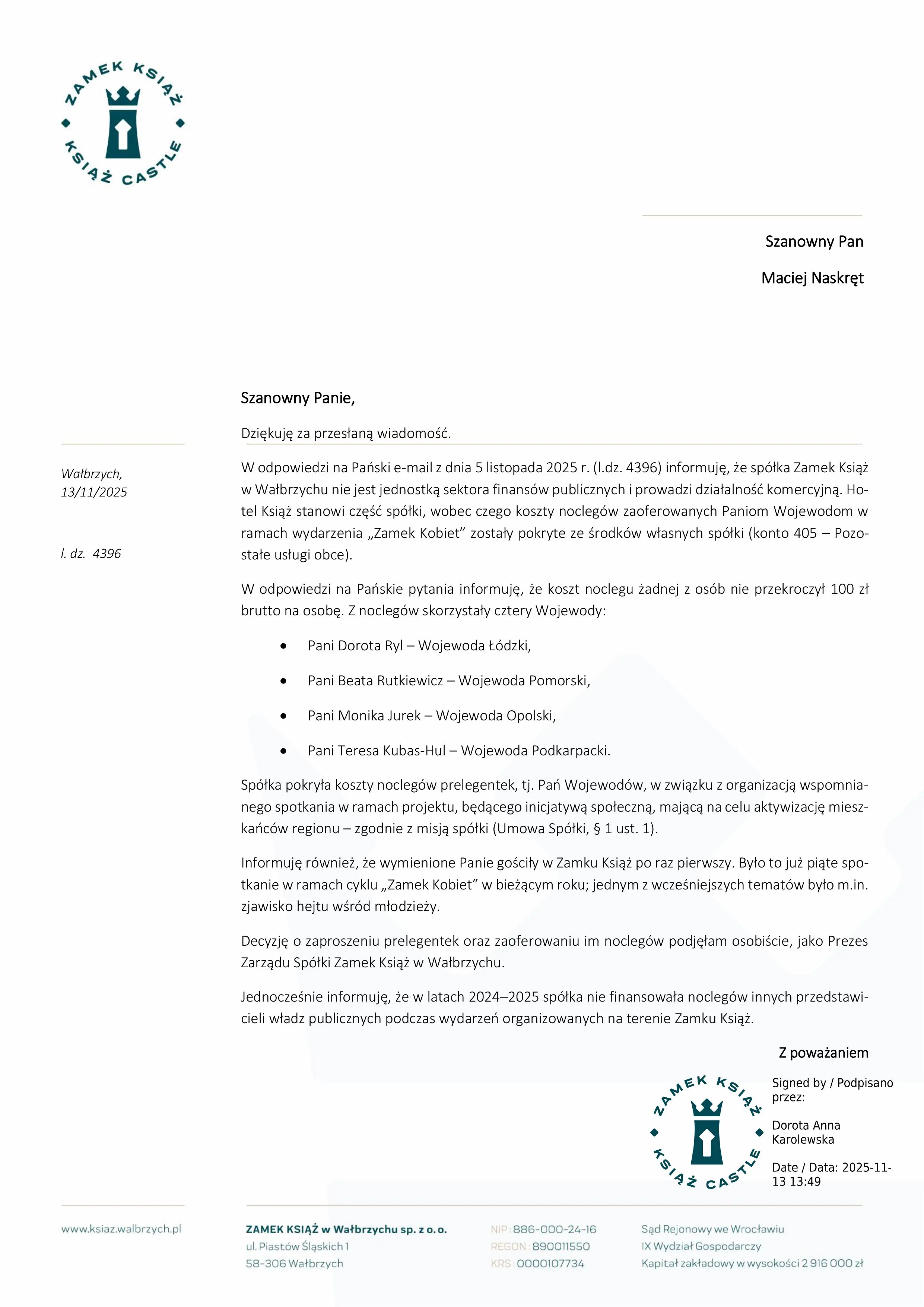 Dla spółki Zamek Książ to była „działalność promocyjna w ramach misji społecznej”. Tak przynajmniej napisała jej prezeska Dorota Karolewska. To ona, bez uchwały zarządu, bez porozumienia z miastem, podjęła decyzję, że cztery panie wojewody będą spały za symboliczną opłatą – z konta spółki miejskiej. Nie było potrzeby tłumaczyć tego mieszkańcom. Bo przecież to „tylko” cztery pokoje. Tylko jedna noc. Tylko kobiety.