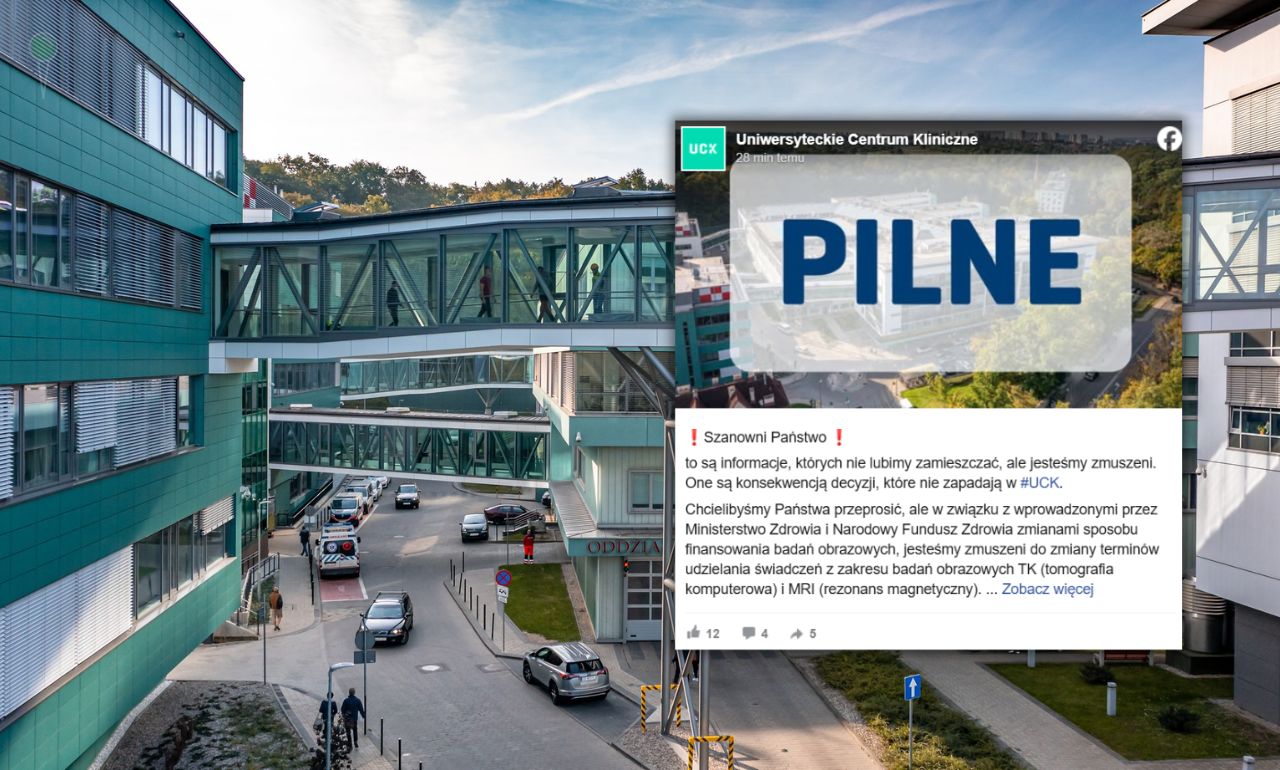 Komunikat Uniwersyteckiego Centrum Klinicznego w mediach społecznosciowych jest krótki, ale bardzo wymowny. Placówka przekazała, że w związku ze zmianami sposobu finansowania badań obrazowych musi zmieniać terminy świadczeń z zakresu TK, czyli tomografii komputerowej, oraz MRI, czyli rezonansu magnetycznego.