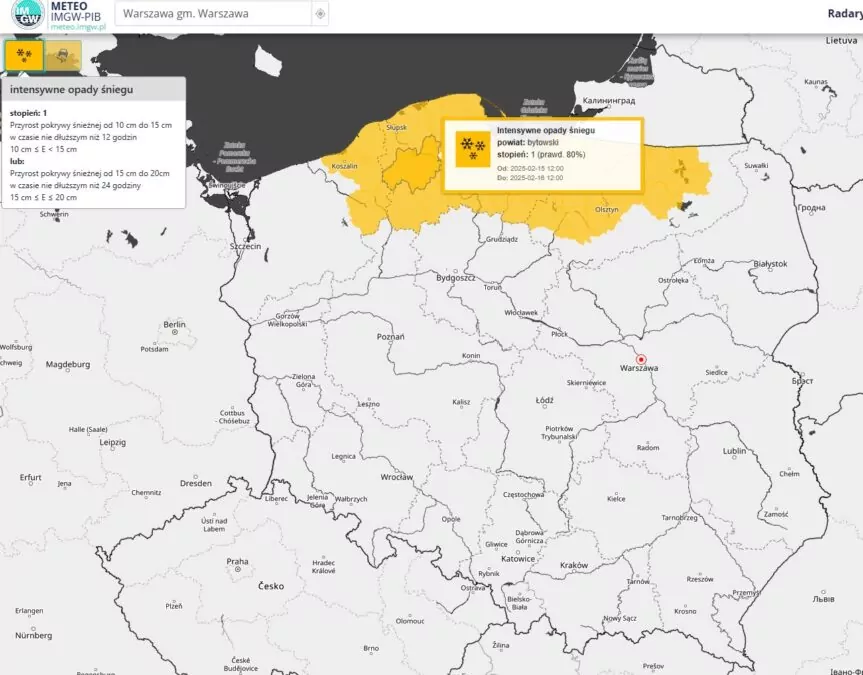IMGW objął ostrzeżeniami północne województwa Polski. Największe ryzyko intensywnych opadów śniegu wystąpi w woj. pomorskim, a także w części woj. warmińsko-mazurskiego i zachodniopomorskiego. Alerty I stopnia będą obowiązywały od godz. 12 i potrwają przez 24 godziny.